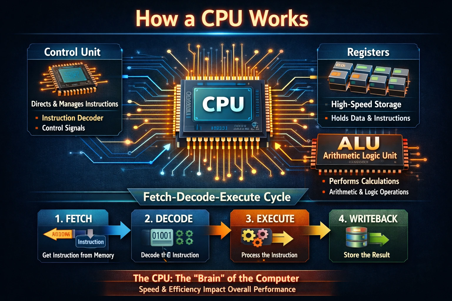 The CPU's heartbeat is this repeating cycle—fetch an instruction, decode it, execute, repeat. Modern ones blast through billions per second, clocked in GHz.